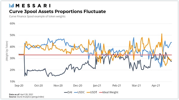 上图:Curve 3pool 中的三项资产 (DAI、USDC 和 USDT) 的权重变化情况,这三项资产之间的权重是此消彼长的关系。