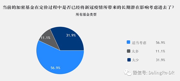 较高比例的加密对冲基金(相比于风险基金和母基金)认为,当前的加密资产在估值定价过程中适当地考虑了Covid-19 所带来的长期影响。风险基金比其他类型的基金更相信在估值定价过程中过多的考虑了Covid-19 所带来的长期影响。