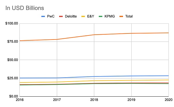 我看了一下安永、普华永道、毕马威、德勤这四大事务所从审计和会计服务中赚取的费用。