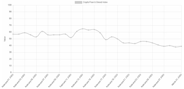 本周比特币波动率指数冲高回落,开盘值1.22,最高值4.34,最低值1.13,收盘值2.08,收盘值较上周同期上涨70.49%,伴随大盘大幅回调波动率加剧。恐惧&贪婪指数7日前为46点,本周最高为46点,最低为38点,恐惧&贪婪指数最新点位39,较上周同期46点下降7点,市场恐惧情绪有所增强。