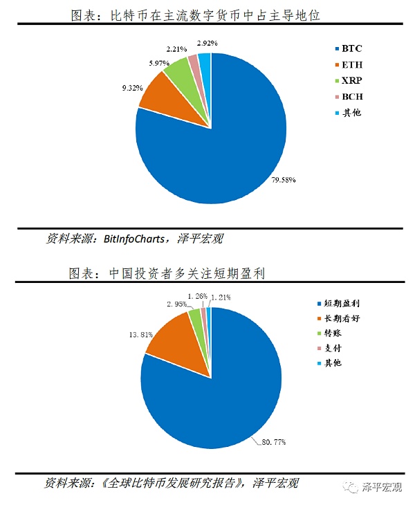 投机需求是主导比特币价格疯涨的内在原因,包括变相换汇、ICO融资等交易活动。而美国等发达经济体对比特币相对宽松的监管态度是比特币的资产泡沫持续膨胀的重要外部因素。根据《全球比特币发展研究报告》数据显示,中国的比特币交易占全球比特币交易量的80%。用户抽样调查显示,比特币的投资者年龄多为30-39岁,具备高中及其以上学历的投资者占比超过80%,IT从业者是占总用户数的比例约为35.45%,80.77%的比特币投资者以短期盈利为目的,仅13.81%的用户选择长期持有。