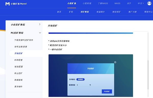 以小麦矿池(Mpool.net)为例,小麦矿池提供了两种连入方式,一种是矿工已有硬盘设备,只需登录小麦矿池官网,下载安装并运行其 PC 客户端,按步骤完成配置即可一键开启 MASS 挖矿;另一种则是直接购买其硬盘矿机并托管(也可提货自管),矿池会完成 P 盘在内的所有步骤。