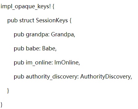 上述代码将4个独立的 Session Keys: Grandpa session key, Babe session key, ImOnline session key, AuthorityDiscovery session key 组合在一起成为一个大的 SessionKeys。