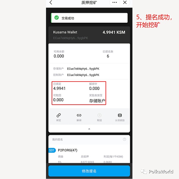 提醒一下,既然这一步属于链上交易,那么必然会收取部分手续费,下面的图片就能看到,我的KSM代币数量已经不足5个。