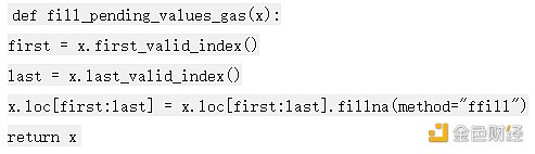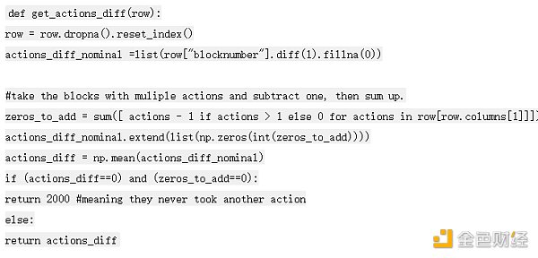 下一组特性包括它们的gas行为。这里的关键概念是捕捉他们的交易 gas 与每个区块的平均确认 gas 相差多远。然后,我们可以为整个拍卖的 gas 价格距离的平均值、中位数和标准差创建特征。有一堆转置和索引重置以按正确的顺序获取区块编号列,但重要的函数是 fill_pending_values_gas,它在捕获的操作之间向前填充 gas 价格。这意味着,如果我在区块编号 1000 处使用 0.05 ETH 的 gas 进行交易,而我的下一个操作是在区块编号 1005 之前我加速到 0.1 ETH 的 gas,那么此函数将用0.05ETH填充编号 1000-1005 之间的区块。
