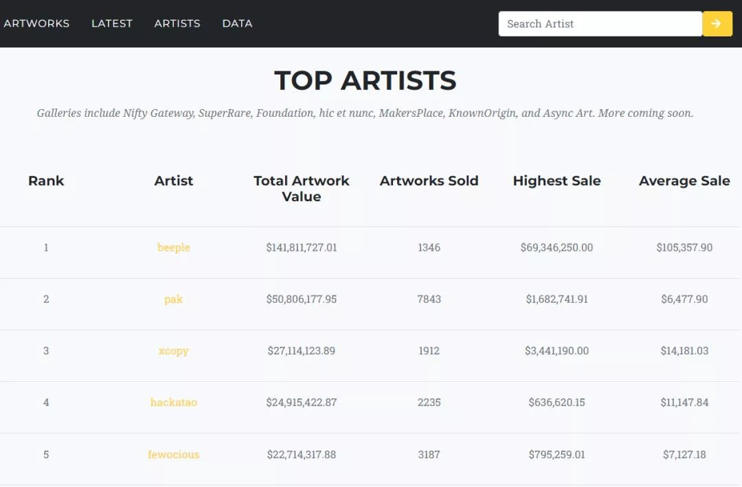 数字艺术家 Beeple 从 2007 年开始每天作图一张,最终把 5000 张图片拼接成一个 316 MB的 JPG 文件,并将其作为 NFT 出售。这个耗时 14 年创作的作品《Everydays: The First 5000 Days》,最终以 6934 万美元的价格在英国著名拍卖平台佳士得上卖出。