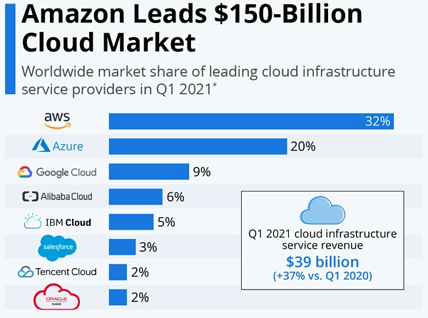 2021 Q1 全球云存储提供商的市场份额(图片来源:https://www.statista.com/chart/18819/worldwide-market-share-of-leading-cloud-infrastructure-service-providers/)