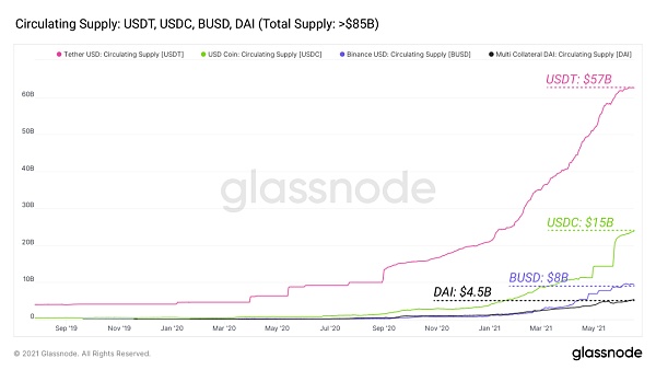 DeFi 中这种增长和对稳定币的依赖似乎并没有放缓的趋势。仅在 5 月份,通过USDT、USDC、DAI和BUSD链上累计转移了超过7500亿美元的价值。拿走这些与美元锚定的稳定币,DeFi 又回到了石器时代——没有明显逃往安全地带,没有更多的借贷市场(对稳定币的高度依赖),并失去了一个最受欢迎的耕作/流动性工具。