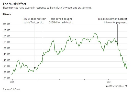时间来到2021年5月,马斯克在推特中说,由于对气候变化之担忧,Tesla已暂停使用比特币购买特斯拉的计划。此推文发出后,比特币应声下跌超过10%,特斯拉股价也出现下跌。事实上,Tesla在3月份宣布接受加密货币时,就曾遭到一些环保团体和投资者的强烈抨击。马斯克也表示,特斯拉目前不会出售比特币,并打算在采矿转向使用可持续能源后再将其用于结算。
