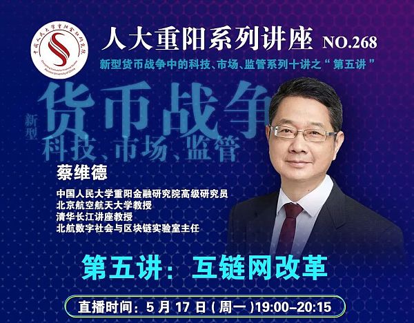编者按:5月17日,中国人民大学重阳金融研究院高级研究员、北京航空航天大学教授,清华长江讲座教授,北航数字社会与区块链实验室主任蔡维德,在人大重阳主办的“新型货币战争的科技、市场、监管”系列直播活动第五讲中,分享了他对“互链网改革”的最新思考。以下为直播视频及实录。
