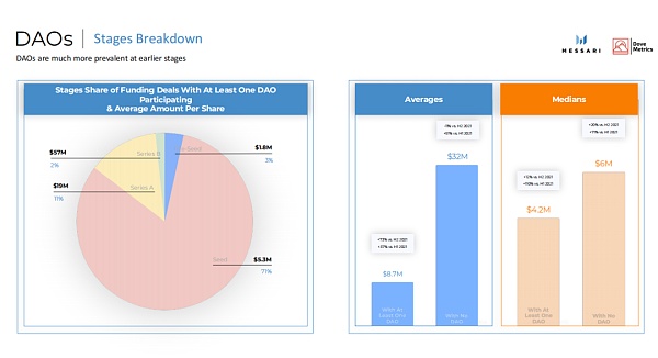 从整体的融资轮次来看,除了 CeFi 项目的融资轮次分布相对均衡外,各个领域拿到投融资的项目均主要集中在早期阶段,这一点在 DeFi 和 NFT 方面体现的最为明显,获早期融资的项目占比超过 80%,占据主导地位。从投资机构的角度来看,DAO 参与投资的项目集中在早期阶段,其参与的所有投资中,71% 处于种子阶段。