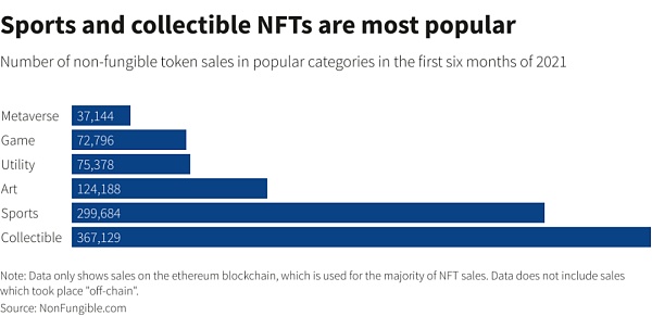 追踪多个区块链销售情况的 DappRadar 表示,2021 年上半年的销售额接近 25 亿美元,高于 2020 年上半年的 1370 万美元。但 NonFungible.com 的这一数字是 13 亿美元,因后者统计时不包括 “DeFi” NFT。