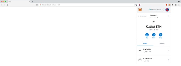 下图就是 MetaMask 在浏览器中的样子。狐狸图标位于角落,一旦登录,用户就可以访问一个微型门户,上面显示着自己的钱包余额,主界面提供了三个关键功能的快速访问入口:购买(Buy)、发送(Send)以及交换(Swap)。??