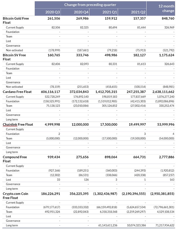 2021年第二季度,转移到公司团队控制地址之外的加密资产净值大幅增加,最高达到了30亿美元。2021年第二季度期间,团队控制地址的资产增加自由流通供应最多的如下: