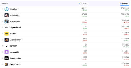 根据DappRadar的数据,在过去的30天里,排名前十的NFT市场的交易额达到了18.6亿美元。
