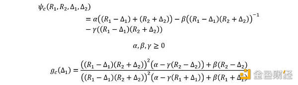 假设池中两种货币的数量分别为 R1 和 R2,在一笔交易中一个交易者想用Δ2 数量的 t2 来买Δ1 数量的 t1。我们可以用一个交易函数ψ来描述一个 AMM 协议,其必须满足在交易前后函数值不变,不变式表示为: