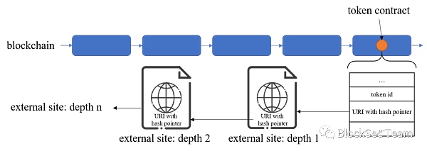 如果合约中所记载的外部链接中没有再额外指向其他地方的链接,即一个外部链接中包含全部描述对应token的信息,那么这种token叫做单级绑定NFT,如图六所示。如果合约中所记载的外部链接中还有指向其他地方的外部链接,即多个外部链接嵌套循环,那么对于这种token叫做多级绑定NFT。如图七所示。如果外部链接的嵌套层数是n,我们就叫n级绑定NFT,区块链层处于第0级(level 0)。