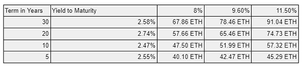 这些资金池可以借入更接近美国国债曲线的资金。这就是为什么我将使用 5 年期、10 年期、20 年期和 30 年期的收益率作为我的贴现率。我使用了上表中对 ETH 奖励的估算,这就是 8%、9.60% 和 11.50% 收益的来源。我使用了这些债券在 2022 年 3 月 28 日某个时候的收益率。