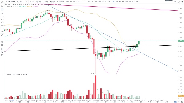在近期市场整体回暖的带动下,LTC也突破了一直处于的区间震荡箱体上沿,同时也是18年熊市最低与19年小牛回落最低连线的周线压制线,而后价格迎来快速拉升,一直涨至目前46美金上方,图形上看也开始接近前期下跌中继支撑位置,这个位置也是存在一定的抛压阻力,也是前期顶点84.4美金下来的斐波那契61.8%回撤位置,这个位置也是形成了共振压力带,后续反弹空间想继续拉大,必须放量突破,均线上也和其余主流币一样,包括指标上也都显示短线多头趋势,多头量能也未发散完毕,短线有望保持强势,操作上沿5日线持有为主。