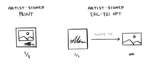 所有这些都非常类似于由数字媒体制作的签名喷墨打印。例如,考虑一位艺术家销售限量版印刷品,这些印刷品代表了他们创作的一些数字艺术品。艺术家选择任意版本尺寸(1、5、50 等),承诺不会分发超过此数量,并在每幅版画上签名,仿佛在说“这件物品很特别”。如果作品受到高度重视,其他人可能会寻求购买并拥有它,也许该物品最终会在私人和公共收藏中获得收购和管理。