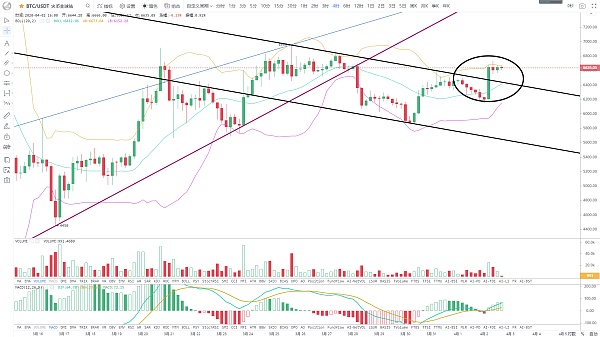 目前价格已突破4小时下降通道,不过量能未能延续,目前又进入横盘震荡走势中,上方短期受阻于30日均线压制,下方较强支撑20日均线,并已出现勾头向上的迹象,表明短期趋势转好的迹象,成交量若能配合,后面大概率将发动新的一波反弹行情,而上方较强压力区位于7000-7200之间,这个区域为去年11-12月筹码密集成交区,前期跌破存在不少套牢盘,同时也是前期高点10500下来的斐波那契50%压制区域,所以一旦这个区域被突破,后续BTC将有望反弹至7500-8000区域,短期看,既然价格选择向上突破了前期高点回落的下降通道,说明短期走势向好,量能配合,那么就有继续反弹上攻前高的机会。