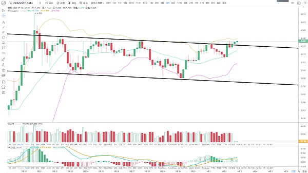 日线级别,目前价格位于布林带中上轨区域,和其余主流币一样,5-20日中短期均线粘合走平,量能逐渐萎缩,整体仍属于联动箱体区间弱势震荡,箱体区间2.1-2.4美金之间,向上放量突破,将有望继续上攻前高5.5美金见顶回落的下降压制线,不过按目前量能,独立行情可能性不大,短期继续联动为主,等待后续箱体突破选择方向。