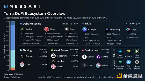 Terra TVL 的 51% 来自债务协议,8% 来自 DEX,36% 来自质押协议。其他新兴生态系统的 TVL 大约有三分之一来自债务协议,不到一半来自 DEX。