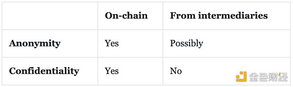上述两种区块链应用的分类为我们提供了一个额外的轴来考虑隐私问题:链上隐私与来自中介机构的隐私。