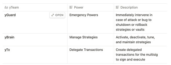 代币持有者创建并投票支持包括 Yearn Improvement、Yearn Signaling 和 Yearn 授权提案在内的提案,这些提案用于做出任何类型的决定。例如,这可以包括使用国库资金、更改多重签名权利、更改特定智能合约或更改 Yearn 协议中的标准费用结构的提议。在此框架内,还存在许多具有特定角色和权力的团队,一些示例如下所示:
