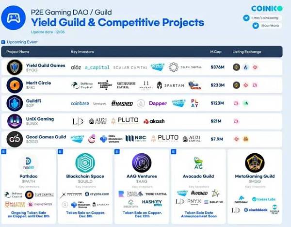 Yield Guild Games?(YGG) 是目前链游打金公会赛道中的龙头,它以DAO的形式进行运营和治理,投资基于虚拟世界和区块链游戏的NFT。YGG的目标是将链游中应用的NFT资产价值最大化,它的协议通过智能合约实现自动化,通过DAO基于治理建议和代币持有人的分布式网络投票达成共识。