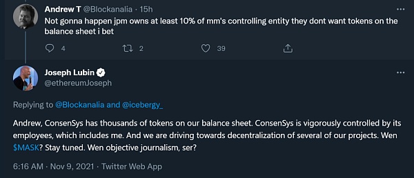 Metamask有望逐步过渡到去中心化治理。ConsenSys创始人Joseph Lubin最近表示Metamask将在不久的将来推出代币。Metamask的高级软件工程师Erik Marks表示,尽管该团队希望Metamask代币的使用方向具有吸引力,但该项目“对让项目由社区拥有的想法完全持开放态度”。一些人推测,如果Metamask确实执行了空投,使用过Metamask互换功能的用户将占主导。