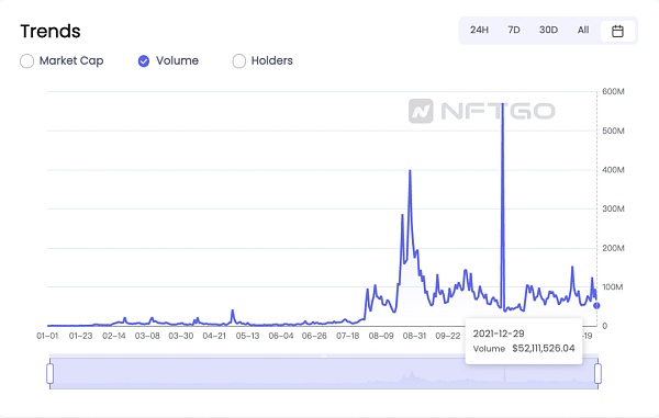 根据nftgo.io的数据显示,截止2021年12月29日,NFT日交易量从2021年1月1日的27万美金,到2021年12月29日的5211万美金的日交易量。2021上半年交易量趋稳,2021年下半年交易量振幅显著。