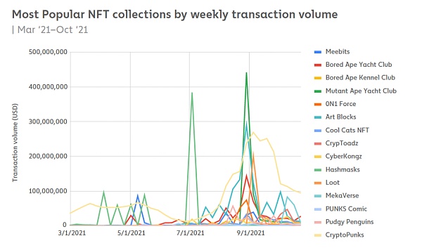 最热门的NFT系列周度交易量 (2021.3--2021.10)