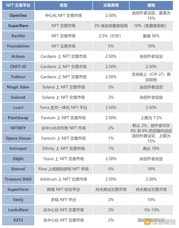 已被用户所熟知的主流 NFT 交易平台包括 Rarible、SuperRare、Foundation 等,其交易费和版税可见下图,扩展信息可参见下文: