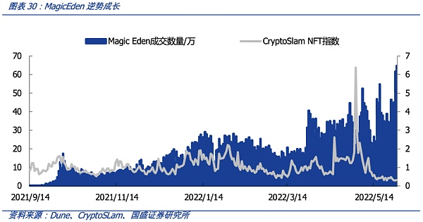 以太坊太贵,Solana快速抢占了“下沉市场”。以太坊仍然是NFT最繁荣的链上生态系统,但短板正在NFT应用的不断发展中暴露,高额的Gas费和网络时不时的拥堵已经成为最大的问题。当普通玩家开始寻找高性价比的NFT时,公链市值排行第三的Solana接住了这些用户,形成了一个NFT的下沉市场。Solana能接得住,一方面在于其网络性能本身,速度快、Gas费低是基础;另一方面是该链上形成了较为完善的NFT生态,包括NFT铸造能力、交易场所以及各种NFT应用项目,这些基础设施能够支持NFT应用从发行、上线到资产交易的商业闭环;更重要的是,Solana链上的一些NFT项目已不再是简单的“仿盘”,开始出现原创和有差异性的新NFT产品。从4月份开始,NFT市场有一段整体的回调,但以MagicEden为首的SolanaNFT生态并没有减速,反而加快了发展。