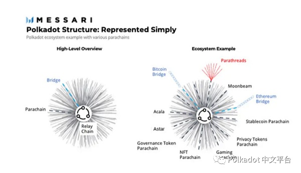 Polkadot 是一个提名证明机制 (NPoS) 的区块链网络,旨在支持各种相互关联的、特定于应用程序的第一层链 (称为平行链)。Polkadot 内部构建的每个链都使用 Parity Technologies 的区块链开发框架 Substrate,它允许开发者选择最适合他们应用特定链的特定组件。Polkadot 指的是插入到一个称为 Relay Chain 的单一基础平台上的整个 parachains 生态系统。这个基础平台不支持应用程序功能,而是包含所有验证器,负责保护、管理和连接平行链。
