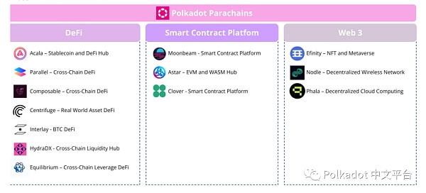 前 13 条平行链中,7 条是DeFi链,3 条是智能合约平台,3 条是 Web3 基础设施链。想要深入了解前 13 条平行链,请查看 Polkadot 生态系统概述。