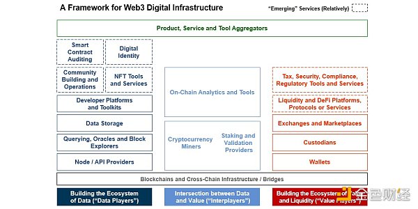在 Web3 中,人们可以考虑在基础计算(区块链)层之上的三类服务和产品中的数字基础设施——数据、价值/流动性和 Interplayers/区块链支持服务。