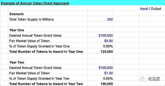 请注意,下面的说明没有考虑通货膨胀的因素。如果你没有固定的token供应,你仍然可以使用这种方法,但你可以考虑定期和/或根据业绩提供额外的token。