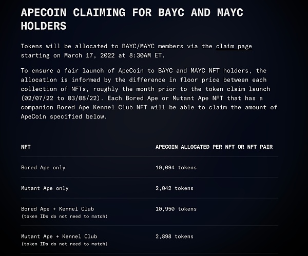 上图:Yuga Labs 向 BAYC 和 MAYC 持有者空投的 APE 代币分配情况。图源:Apecoin.com