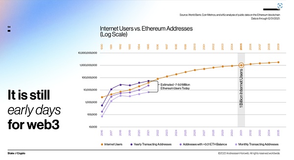 尽管 web3 的具体用户数量难以计算,但我们可以推算出这场 web3 运动的规模。根据不同的链上参数,我们的团队评估得出现在的以太坊上活跃着大约 7 百万到 5 千万的用户。(请看第 54 张幻灯片。)对比早期的商业互联网,我们的发展大约处于 1995 年左右。