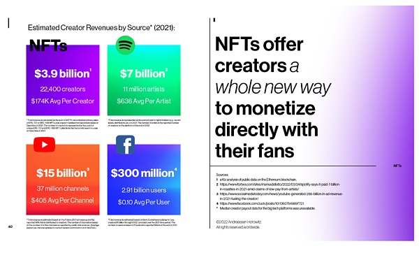 我们团队进行了新的数据分析,以评估对比 web2 和 web3 支付了多少酬金给创作者。(请看第 40 张幻灯片)尽管为时尚早,但这个数据依旧说明了问题。
