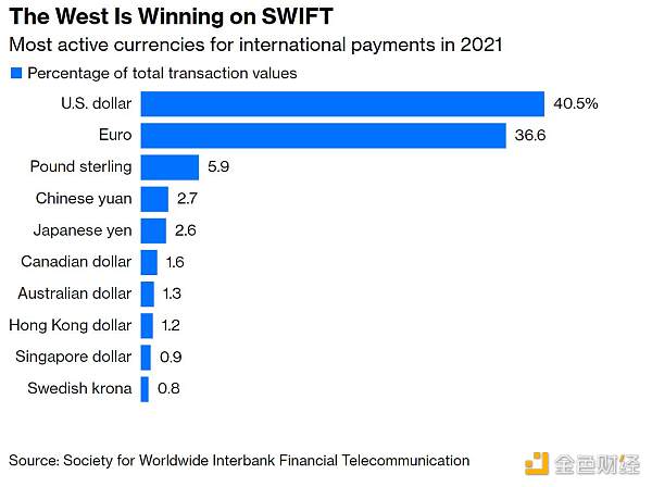 这也不是衡量美元主导地位的唯一指标。2021 年,按总交易价值计算,40% 的国际支付使用美元。排在第二位的是欧元。人民币排在第四位,仅为2.7%,甚至落后于英镑。