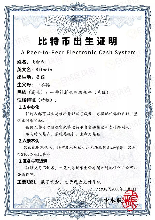 比特币出生证明如下: