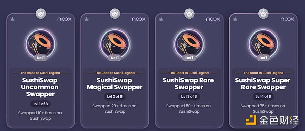 Noox是以太坊生态旨在构建一个去中心化的成就证明平台,用户在满足相应条件后,即可铸造对应的NFT,称为“徽章”。Noox徽章记录着用户的链上行为,用户能够可视化他们所做的事情,如通过SushiSwap的徽章,用户可以了解自己在SushiSwap上的交易次数范围。