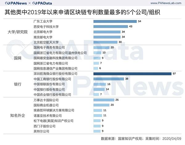 除了BATJP以外,大学/研究院、国家电网、银行和外企这四大类别中的企业/大学也公开了不少区块链技术。尤其是大学/研究院系统中,272家单位自2019年至今公开了1191个区块链专利。其中,广东工业大学是公开区块链专利最多的学校,共有54个,其次西安电子科技大学、北京邮电大学、南京邮电大学和北京航空航天大学,都超过了30个相关专利。