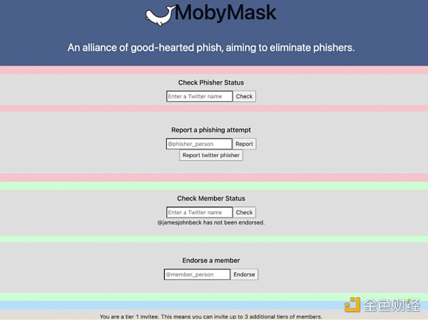 具体来说,MobyMask 是一个报告网络者的项目。该项目的亮点在于其创建了一个名为 Delegable 的信任网络。它允许用户签署将自己的信息授予他人的链下消息,并且是不可转让的。用户使用该项目,则可以通过输入有嫌疑的 Twitter 账号来举报网络钓鱼者。同时还可以通过邀请你信任的人,生成邀请链接来扩大举报网络钓鱼者网络,并且所有举报都是透明的,用户不用担心会泄露自己的信息。
