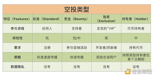 空投是一种推广和分发项目代币的方法,以帮助启动和提供资本,并通过去中心化提高安全性。通常情况下,空投是给那些在早期发展过程中交互、构建或普遍参与项目的白名单地址。有几种不同类型的空投,我在下面详细说明: