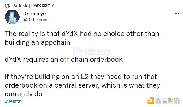 Solidity 开发者 0xTomoyo 则从技术角度深入分析了迁移原因。当前 dYdX 订单簿是在链下的中心化服务器上运行,L2 仅用于结算匹配交易。理论上他们可以在 L2 上构建带有内存的订单簿,但目前这样的工具并不存在。因此,dYdX 选择在 Cosmos 上构建一条新链,每个验证者都运行一个内存订单簿。这样进一步实现协议的去中心化。