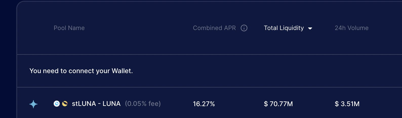 与 bLUNA 相同,stLUNA 也来自 Lido,但不同的是 stLUNA 可以获得自动复利的质押奖励。但尚不清楚是否会获得空投,所以我假设无法获得空投。你不必像 bLUNA 那样不得不赎回 UST。也可组成 stLUNA-LUNA LP 来赚取 16% 的 APR。